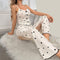 The accompanying summer bra is designed with both style and support in mind. The bra features adjustable straps and a hook-and-eye closure, allowing for a customizable fit. The lightweight fabric ensures breathability and comfort, making it ideal for warm weather. The subtle gemstone embellishments on the bra add a touch of elegance, perfectly complementing the high-waisted pants.