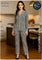 The deep black base is beautifully highlighted with subtle silver lining patterns, creating a sophisticated and modern design that adds a touch of luxury to your nightwear collection. The relaxed silhouette drapes gracefully, ensuring ease of movement while maintaining a flattering look. Whether you’re winding down after a busy day or enjoying a cozy weekend at home, this set blends practicality with refined style.