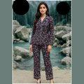 The deep black base is beautifully enhanced with vibrant purple and orange patterns, creating a striking design that blends elegance with playful energy. The relaxed silhouette drapes gracefully, allowing ease of movement while maintaining a flattering look. Whether you’re winding down after a busy day or enjoying a cozy weekend at home, this set is designed to keep you comfortable without compromising on style.