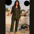 The striking black base is beautifully enhanced with vibrant multicolor ring patterns, creating a playful yet sophisticated design that adds charm to your nightwear collection. The relaxed silhouette drapes gracefully, allowing ease of movement while maintaining a flattering look. Whether you’re winding down after a busy day or enjoying a cozy weekend at home, this set is designed to keep you comfortable without compromising on style.